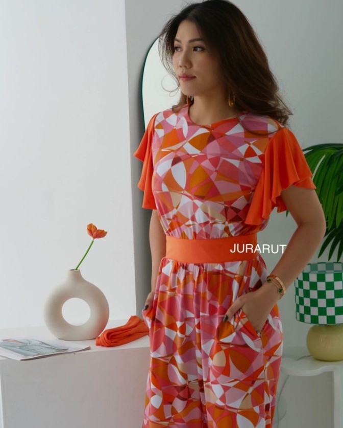 ตัวนี้ใส่สบายมาก ผ้ายืด เป้าไม่รั้ง เป็นทรงคอกลม แต่งสีพื้นช่วงแขนระบาย และขอบเอว มาพร้อมสายผูกเอว จะผูกหรือไม่ผูกก็ได้ค่ะ มีกระเป๋าข้างมาให้เพิ่มความเก๋ของชุด
