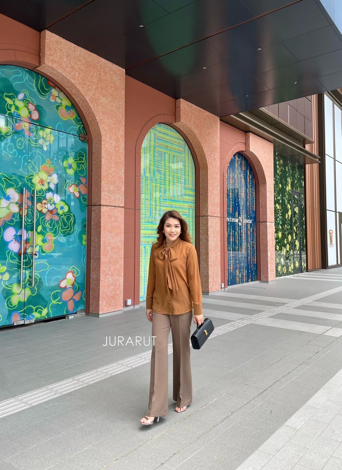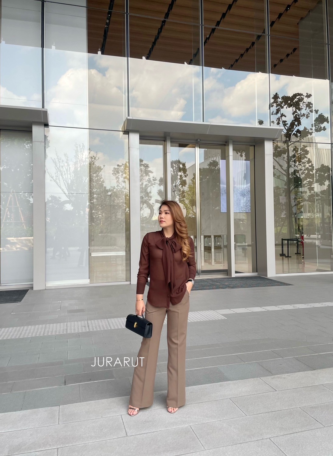 ดีไซน์เป็นผูกโบว์เก๋ๆ กระดุมปั๊ม แมชกับกก.ทรงตรงสีท๊อฟฟี่