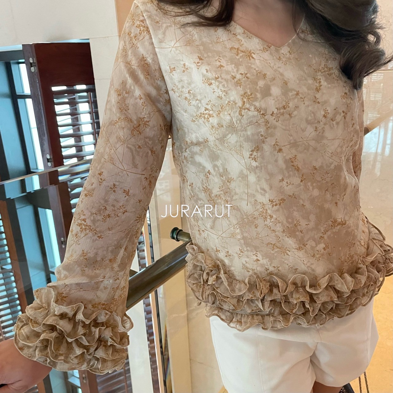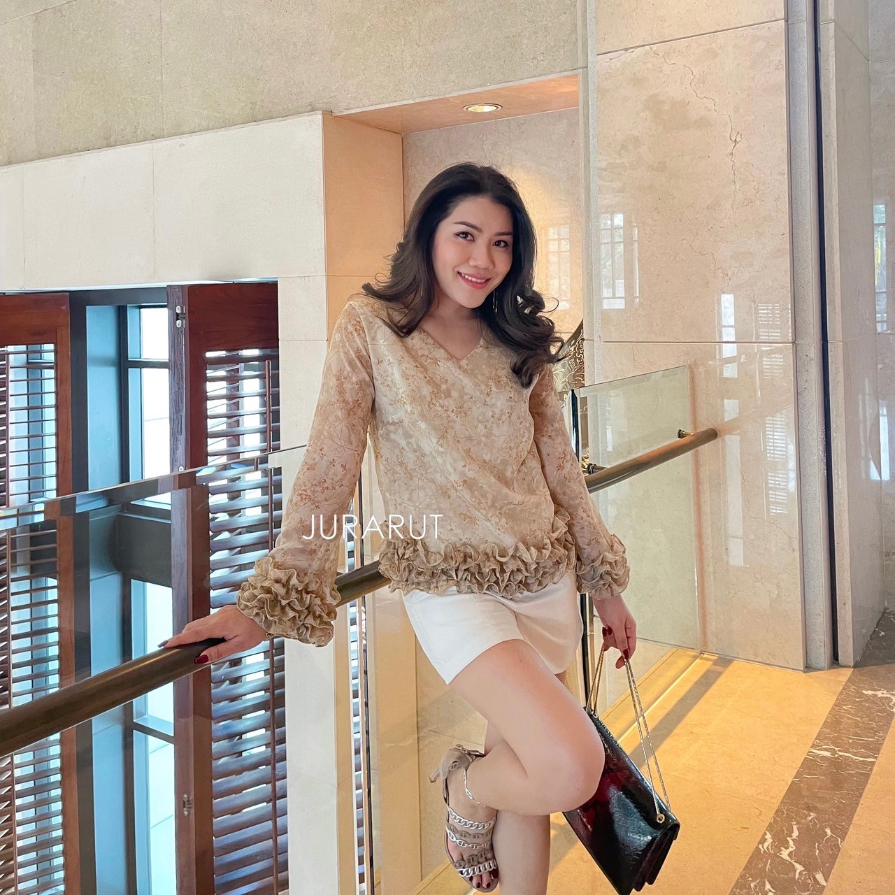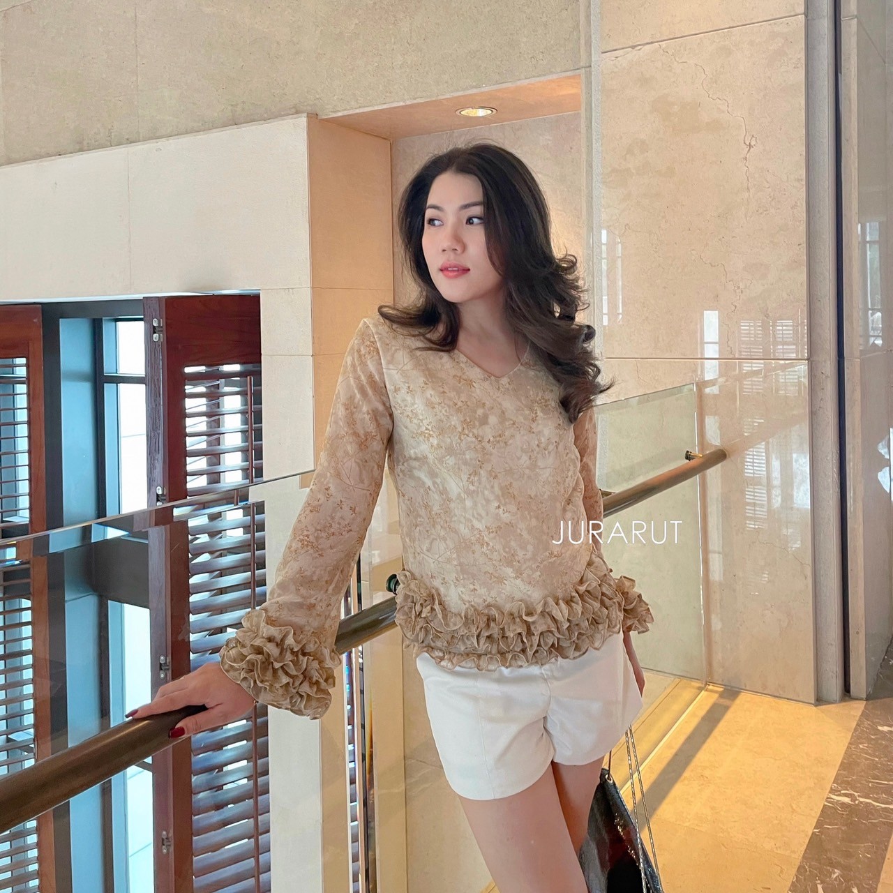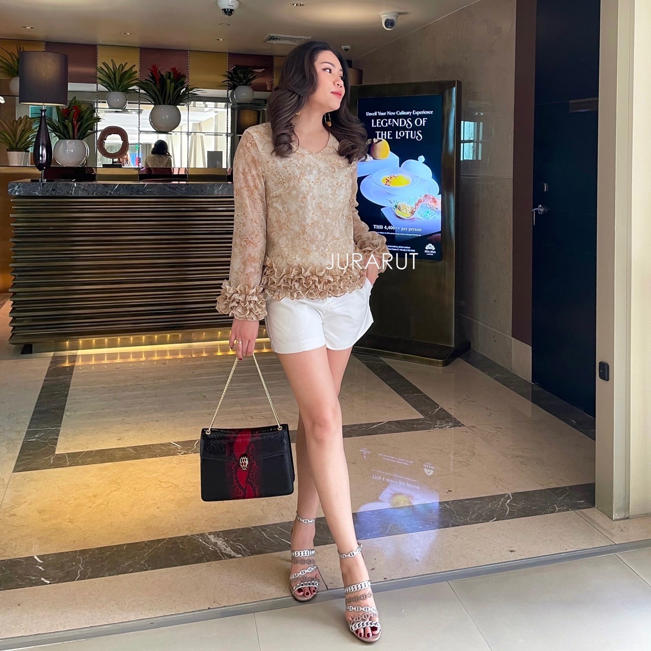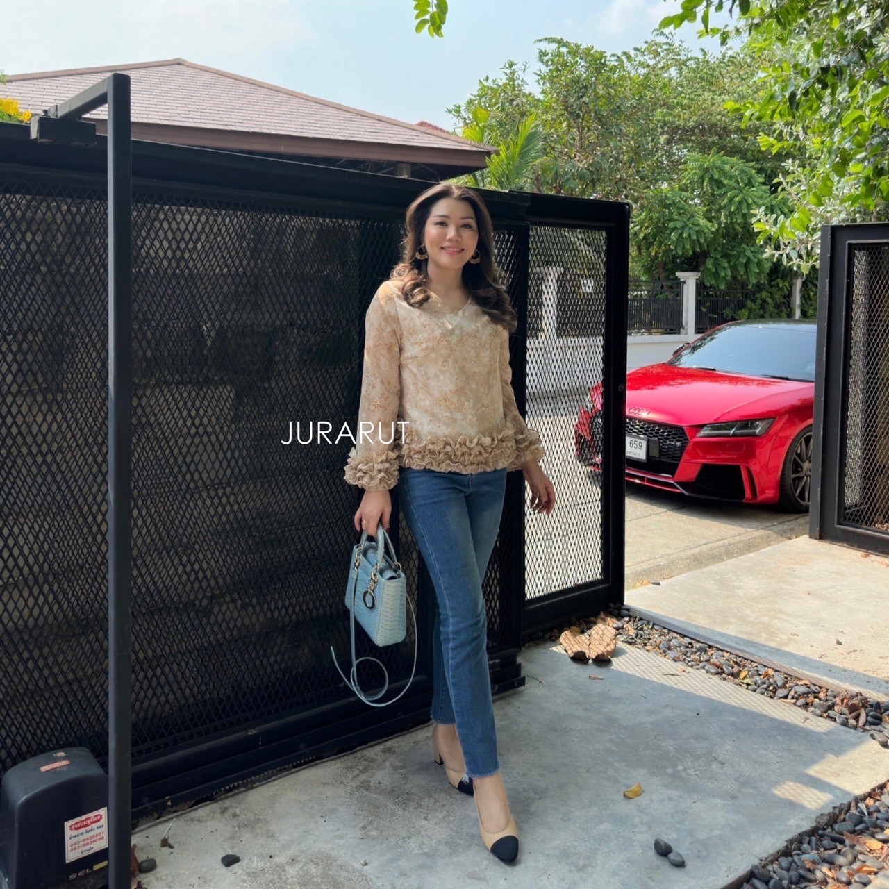 ทรงนี้สวยมาก เป็นคอวี ไม่ตัน ปลายแขนกระดิ่งนิดๆ จับแต่งรูดปลายแขนและชายเสื้อ มีซับใน เป็นผ้าเกาหลีมีเทกเจอร์ในตัว