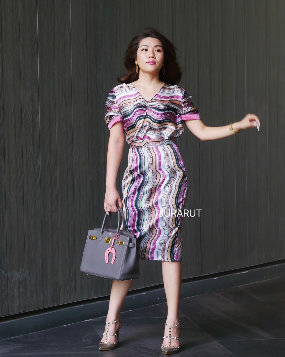 ตัวนี้สวย คอวี จับจีบย่น เพิ่มดีเทลให้เสื้อ ช่วงแขนจับจับ และแต่งสีพื้นตัดขอบ สวยลงตัวมากๆ